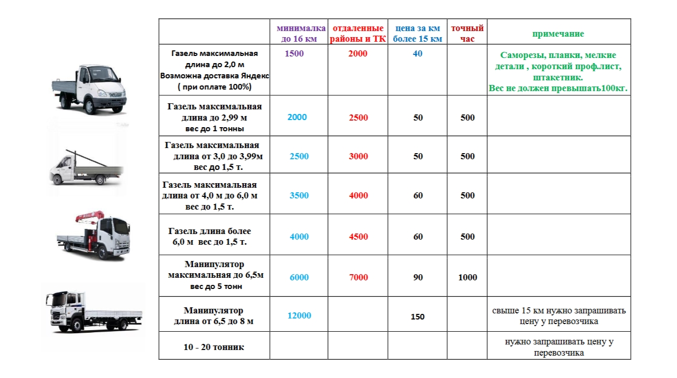 Примечание: Свыше 15 км нужно запрашивать цену у перевозчика.